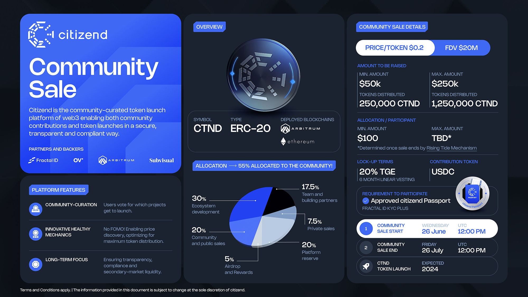 The citizend Community Sale is the first chance for the community to contribute to the project. Learn more about the key dates and mechanics below.