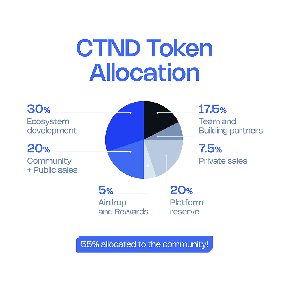 * **Airdrop & Rewards** - 5,000,000 CTND (5% of total supply | 20% unlocked on TGE, rest 6 months vesting): used for individuals that provide support and back the project prior to network launch.